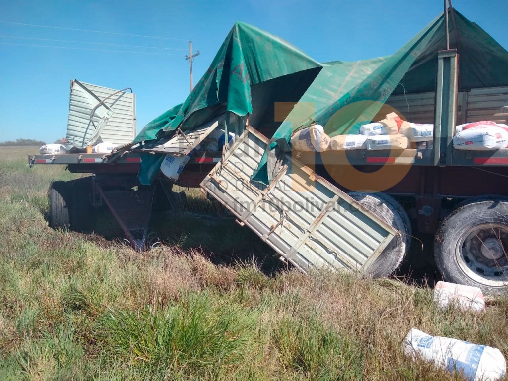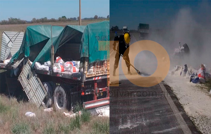 Dos camiones que viajaban en sentido inverso, uno de ellos cargado de Harina en bolsas que transitaba en sentido Bolívar-Olavarría. Mientras el restante transporte que remolcaba una llamada Batea. Por causas a determinar, el acoplado cargado con harina se habría desprendido e impacto de manera fronto-lateral y se desplazó haica el préstamo la ruta con los daños que las imágenes reflejan.