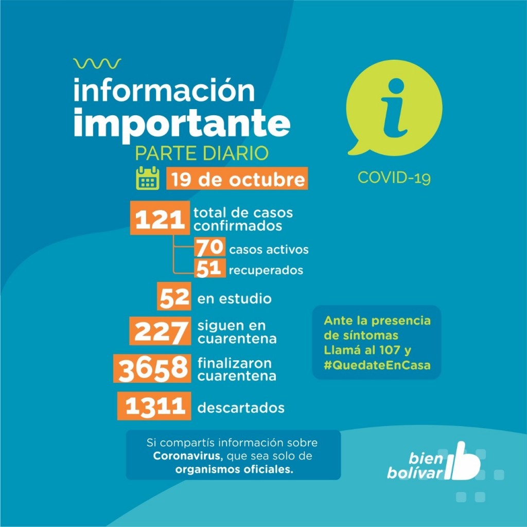 La información fue recibida esta tarde desde la Oficina de Prensa Municipal. Totalizan 121 los casos desde el inicio de la pandemia, con 51 recuperados y 70 casos activos al día de la fecha. Para hoy se aguarda el resultado de 52 muestras al final de la jornada.-