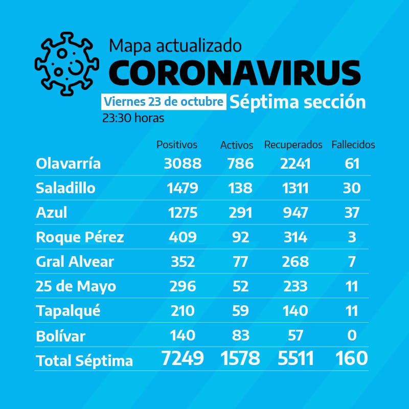 En los Municipios de la Séptima Sección, este viernes 23 de octubre se registraron 96 casos positivos en Olavarría, 28 pacientes en Saladillo, 13 nuevos casos en Roque Pérez, 11 pacientes en Azul, 6 nuevos casos en Tapalqué, 6 casos en Bolívar, 3 pacientes en Alvear y 3 casos en 25 de Mayo.