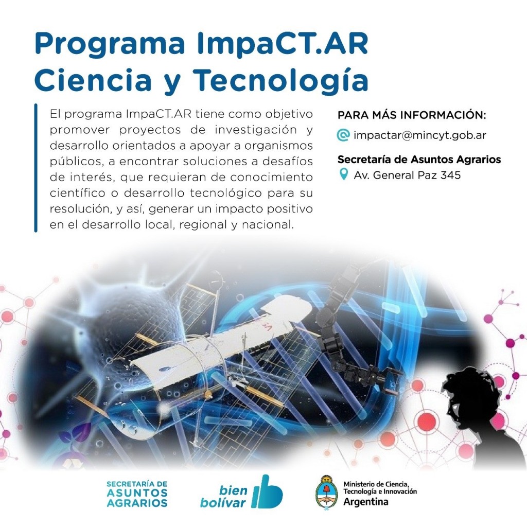 Con la finalidad de fortalecer el impacto de la ciencia, la tecnología y la innovación en la construcción y aplicación de políticas públicas, el Ministerio de Ciencia, Tecnología e Innovación de la Nación, a través de la subsecretaría de Coordinación Institucional, creó el Programa ImpaCT.AR Ciencia y Tecnología, que se trabaja a nivel local de manera articulada con la Secretaria de Asuntos Agrarios.