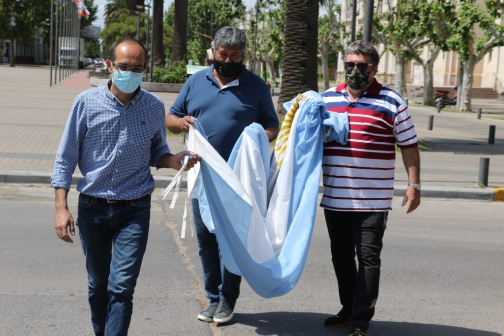 En el marco de la conmemoración del Bicentenario del primer izamiento de la Bandera Argentina en las Islas Malvinas, el intendente Marcos Pisano junto a veteranos bolivarenses realizó el izamiento en el mástil central.
