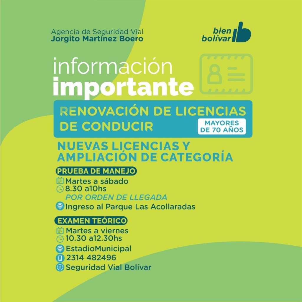 La Agencia funciona de lunes a viernes, de 7.30 a 13.30 horas, las personas hasta los 69 años que se encuentren en condiciones de realizar la renovación por vencimiento, deberán solicitar el turno a través de la página: www.bolivar.gob.ar/servicios/turno-licencia/. Cabe destacar que como medida preventiva se darán turnos de a dos personas cada 40 minutos.