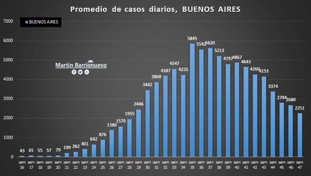 En la provincia de Buenos Aires, desde las semana 44 hasta la actual que es la 47 descendieron 1123 casos promedio. La curva es levemente descendente en la mayoría de las ciudades bonaerenses, con algunos altibajos como se producen en Bolívar. No deja de ser auspicioso si bien queda claro que puede haber días complicados.
