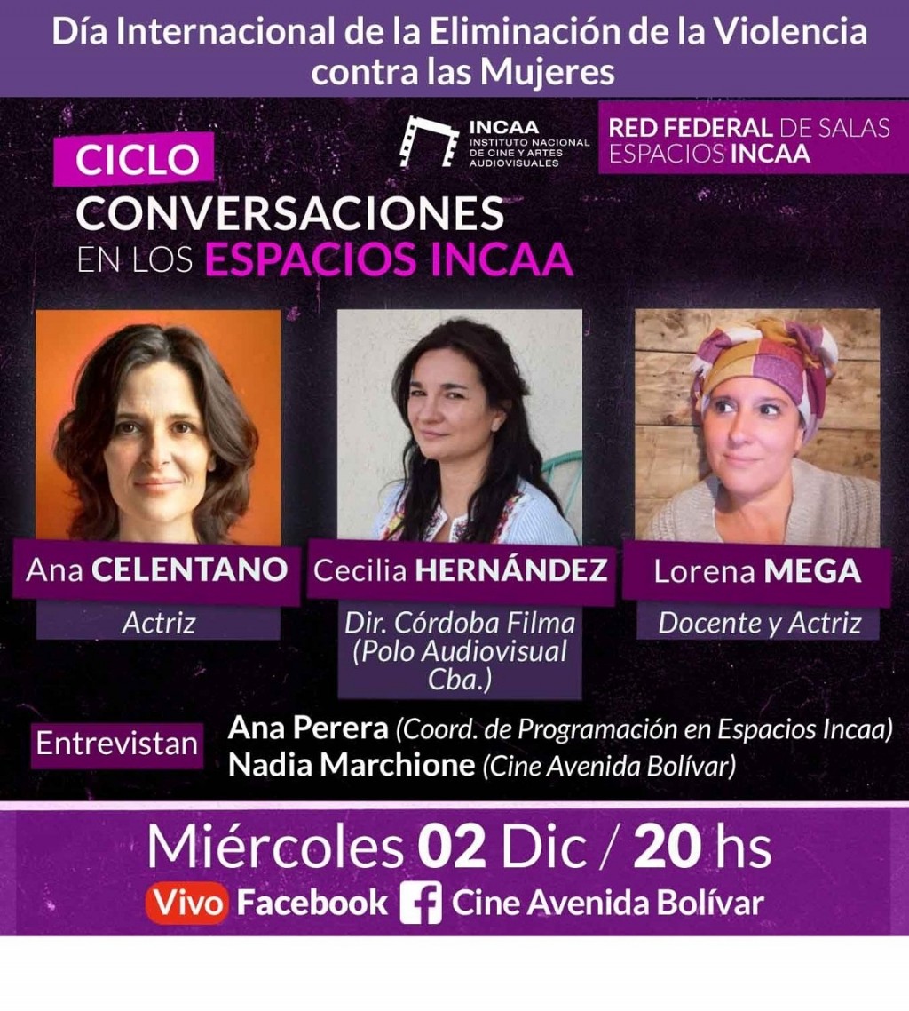 Se reprogramó para este miércoles 2 de diciembre la última charla del Ciclo Conversaciones en los Espacios INCAA, que en esta oportunidad conmemorarán el Día de la Eliminación de la Violencia Contra las Mujeres.-