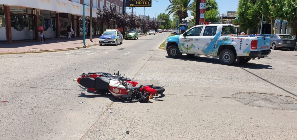 Ante la notificación desde el Centro de Monitoreo Municipal, arriba al lugar del accidente el móvil nº1 de Defensa Civil a cargo de Roque Bazán quien informa que se trataba de un vehículo Peugeot 206 (HJK-086) conducido por una mujer mayor de edad, mientras la otra parte involucrada es una moto Yamaha FZ-S conducida por un joven mayor de edad, quien fue trasladado al nosocomio local en ambulancia del SAME a cargo del doctor Lima.