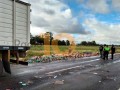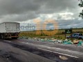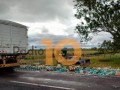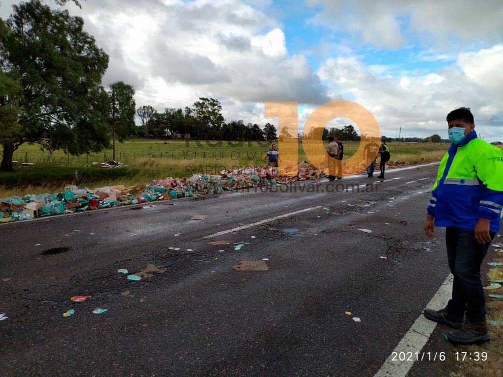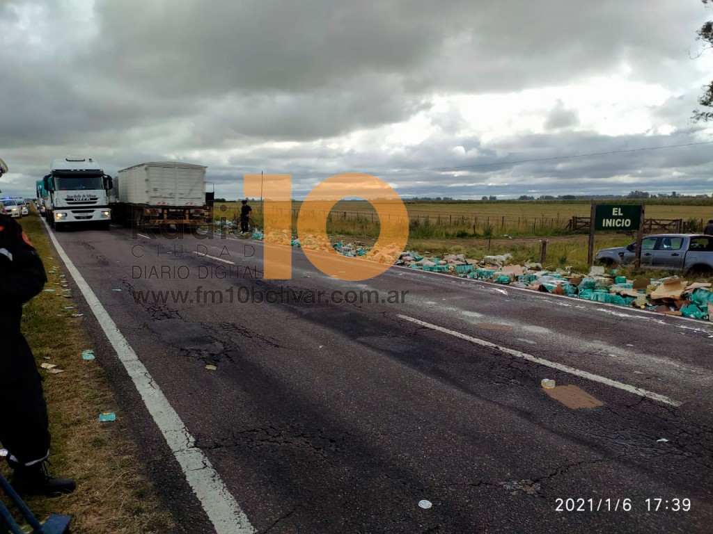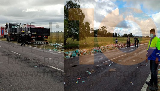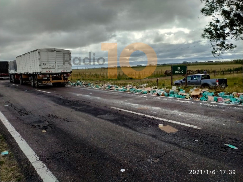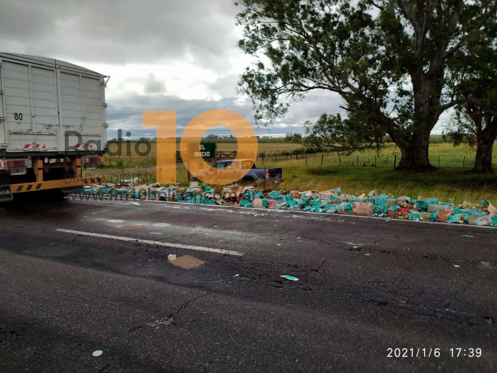 Esta tarde en el marco de las dificultades climáticas que afectan la circulación y ante un estado de daño considerable de la cinta asfáltica, ocurrió el vuelco de un transporte que trasladaba envases con cerveza.