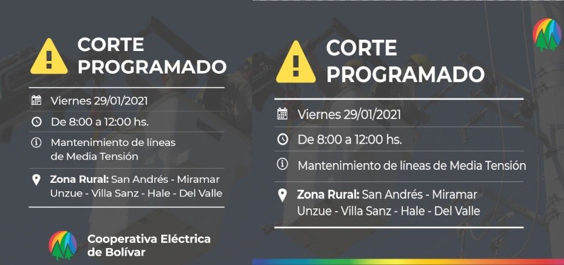 La Cooperativa Eléctrica de Bolívar Informa que se realizará un corte programado de suministro eléctrico en la jornada del viernes 29 en la franja horaria comprendida entre las 8:00 y las 12:00.
