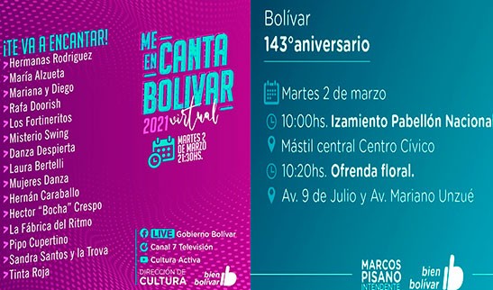 En el marco del aniversario de la ciudad, este martes a las 21:30hs se estrenará el festival Me EnCanta Bolívar 2021 Virtual, la transmisión se realizará a través de la cuenta de Facebook Gobierno Bolívar, en el canal de Youtube Cultura Bolívar y por el canal local.