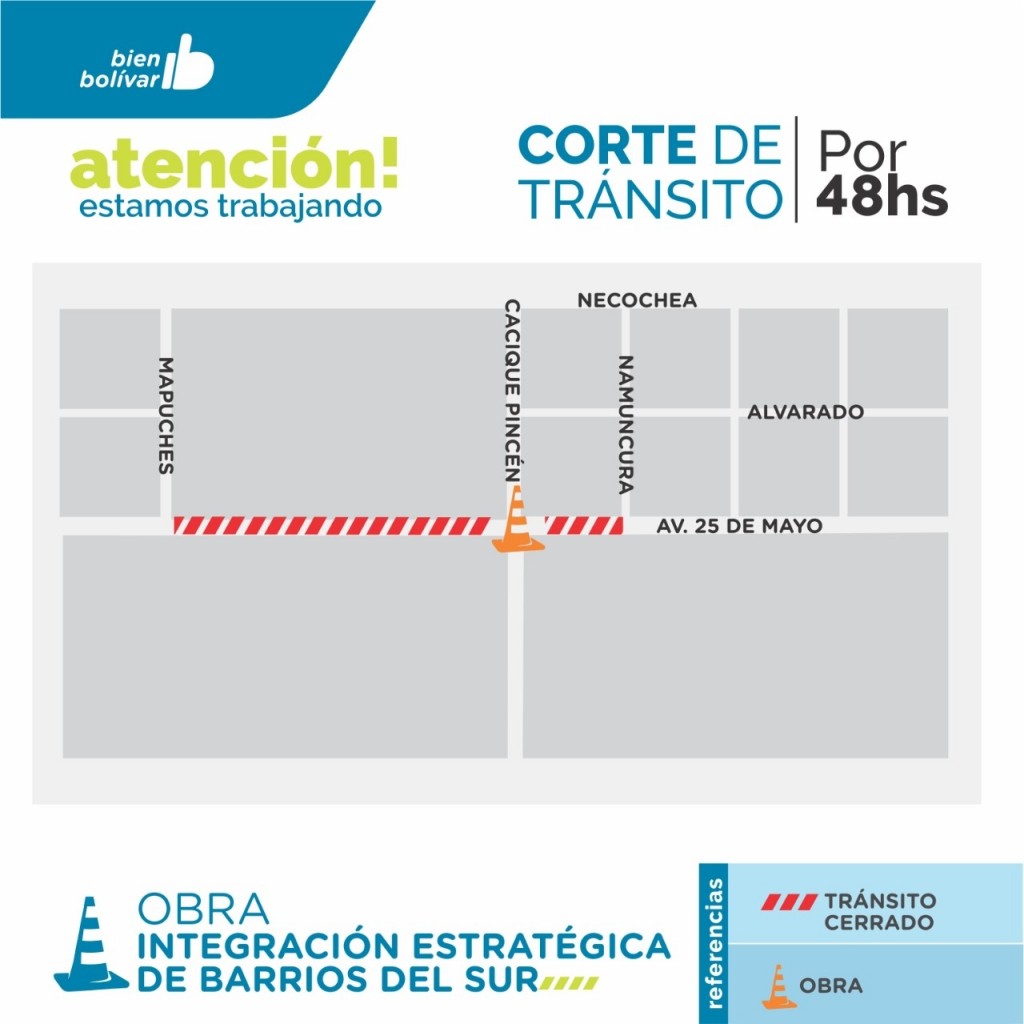 En este sentido, la Dirección de Obras Públicas informó esta mañana que durante las próximas horas permanecerá cortado el tránsito en la Av. 25 de Mayo, desde calle Namuncurá hasta calle Mapuches, debido a que en la intersección de las avenidas 25 de Mayo y Cacique Pincén se está ejecutando la obra Integración Estratégica de barrios del Sur.