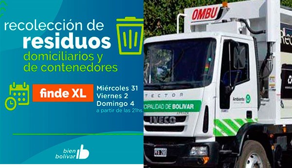 Teniendo en cuenta el feriado nacional la recolección de residuos domiciliarios se realizará los días miércoles 31, viernes 2 y domingo 4 a partir de las 21hs.