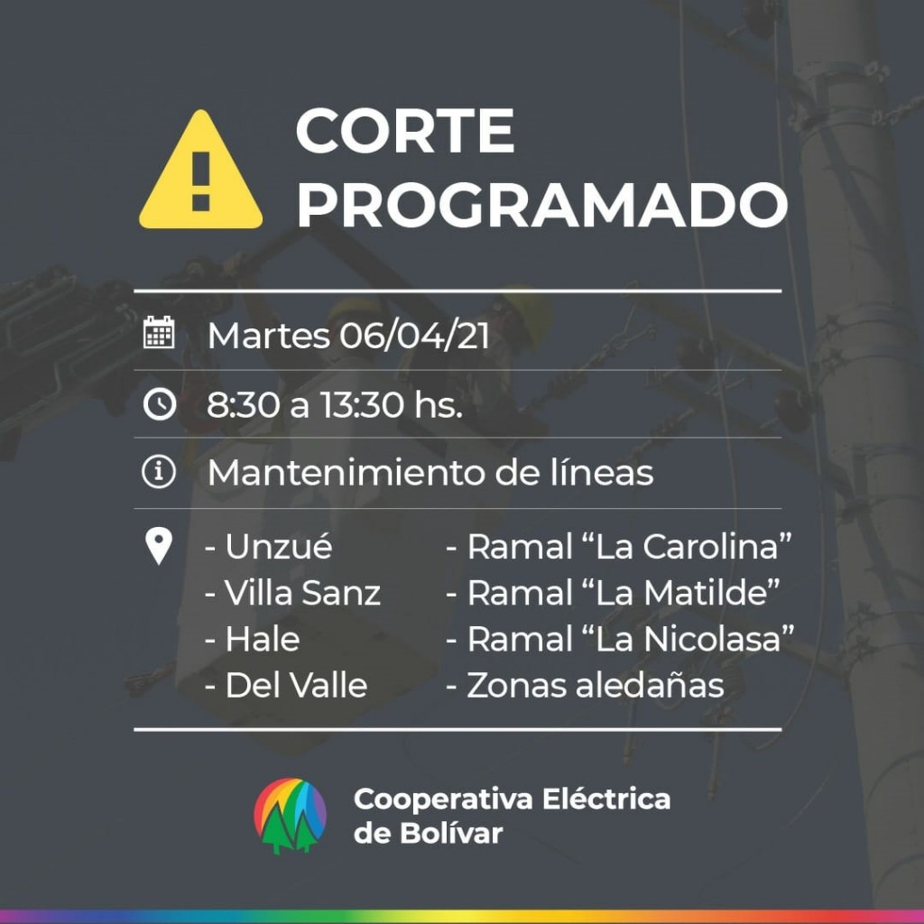 La Cooperativa Eléctrica de Bolívar Ltda. de Consumo pone en conocimiento de sus Asociados detalles sobre un corte programado de suministro eléctrico.