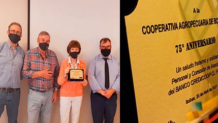 La entidad cooperativista hizo entrega de una placa en homenaje al 75° aniversario de la Cooperativa Agropecuaria. Este lunes a la mañana se realizó la entrega de placa con la que la filial Bolívar del Banco Credicoop eligió celebrar el 75° aniversario de la Cooperativa Agropecuaria.