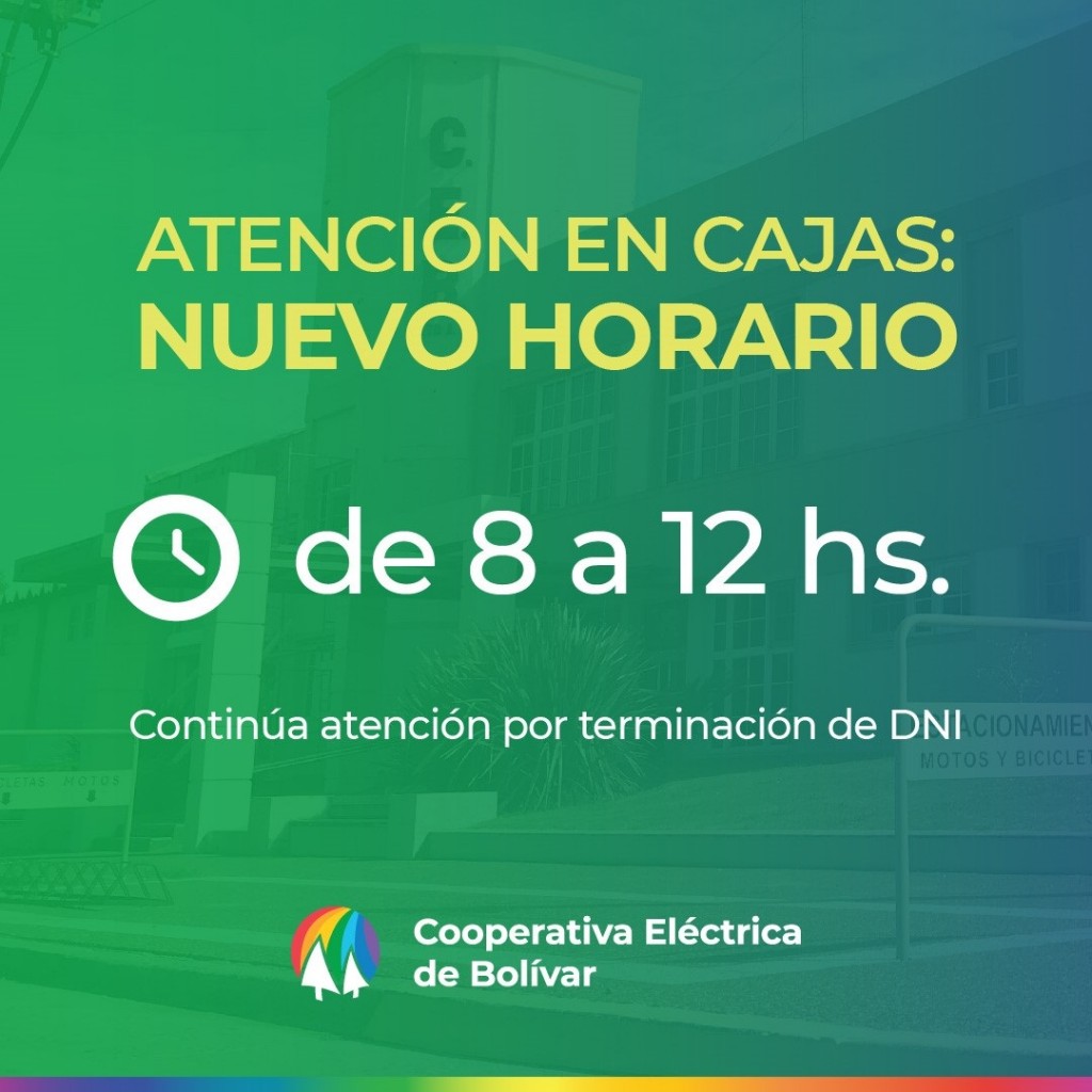 La Cooperativa Eléctrica de Bolívar informa que debido al agravamiento en la situación sanitaria, a partir de este martes 20/04 se reduce el horario de atención en Cajas de 8 a 12 horas.-
