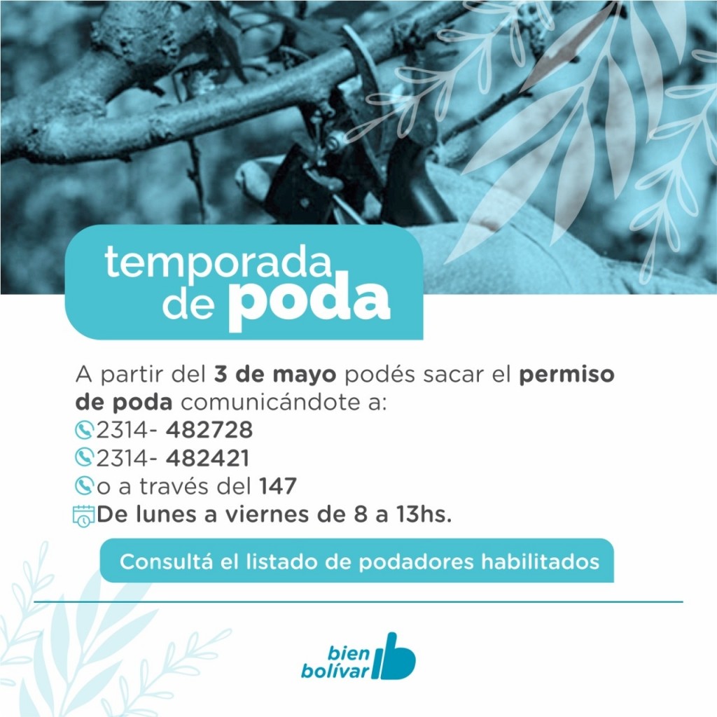 Según establece la Ley de Arbolado Público Urbano la temporada de poda es desde mayo al mes de agosto y con la finalidad de realizar la poda uniforme del arbolado público, los vecinos de Bolívar podrán solicitar el permiso de acuerdo al instructivo municipal y el listado de podadores habilitados en la página web: www.bolivar.gob.ar/servicios/poda/ .Asimismo, también se podrá gestionar el permiso a través de las líneas telefónicas 15482421 o 15482728.