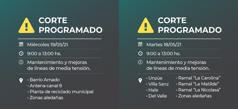 Se harán dos cortes de energía programados para hoy 18 y mañana 19 por mantenimiento en las líneas de tensión