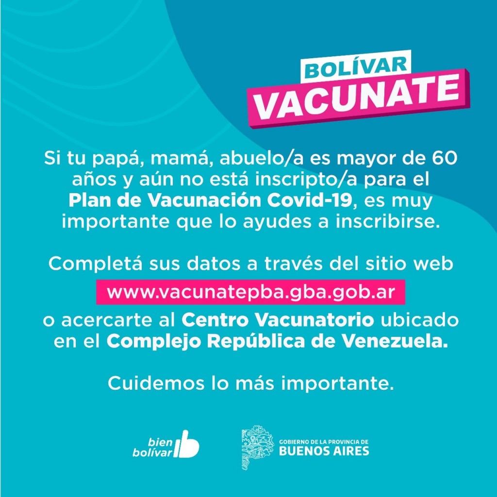 En el Partido de Bolívar son aproximadamente 18 mil los inscriptos al Plan Provincial de Vacunación contra el Covid-19, y fueron inoculados hasta el momento 9.222 bolivarenses. El objetivo de la gestión Municipal, que trabaja en coordinación permanente con el Ministerio de Salud Bonaerense, es vacunar a toda la población de riesgo, por lo que se solicita la inscripción de aquellos adultos mayores de 60 años que todavía no se han registrado.