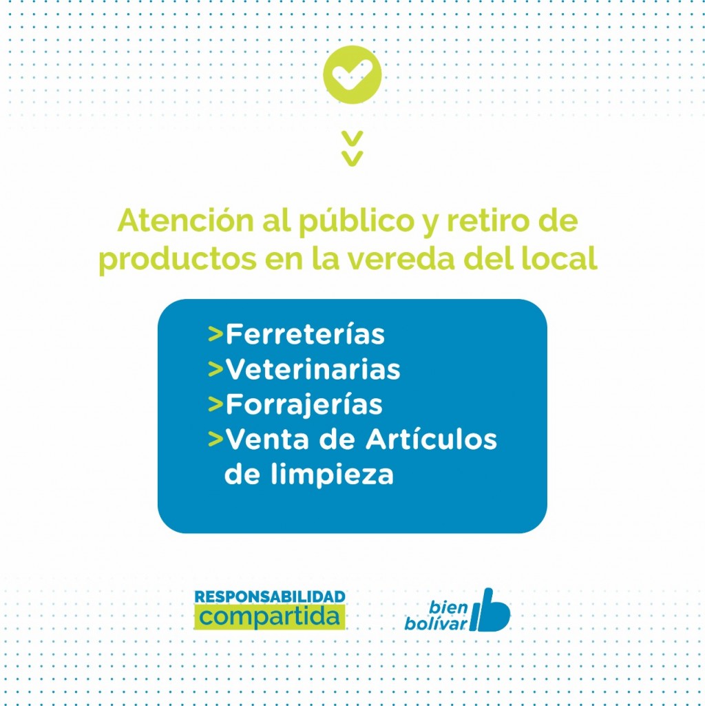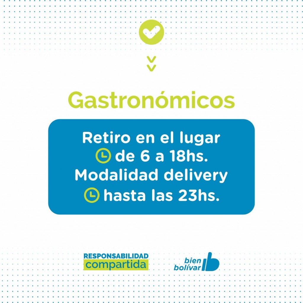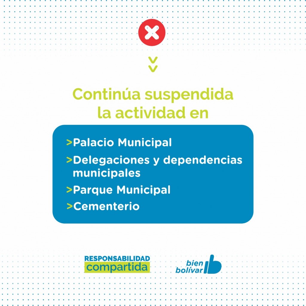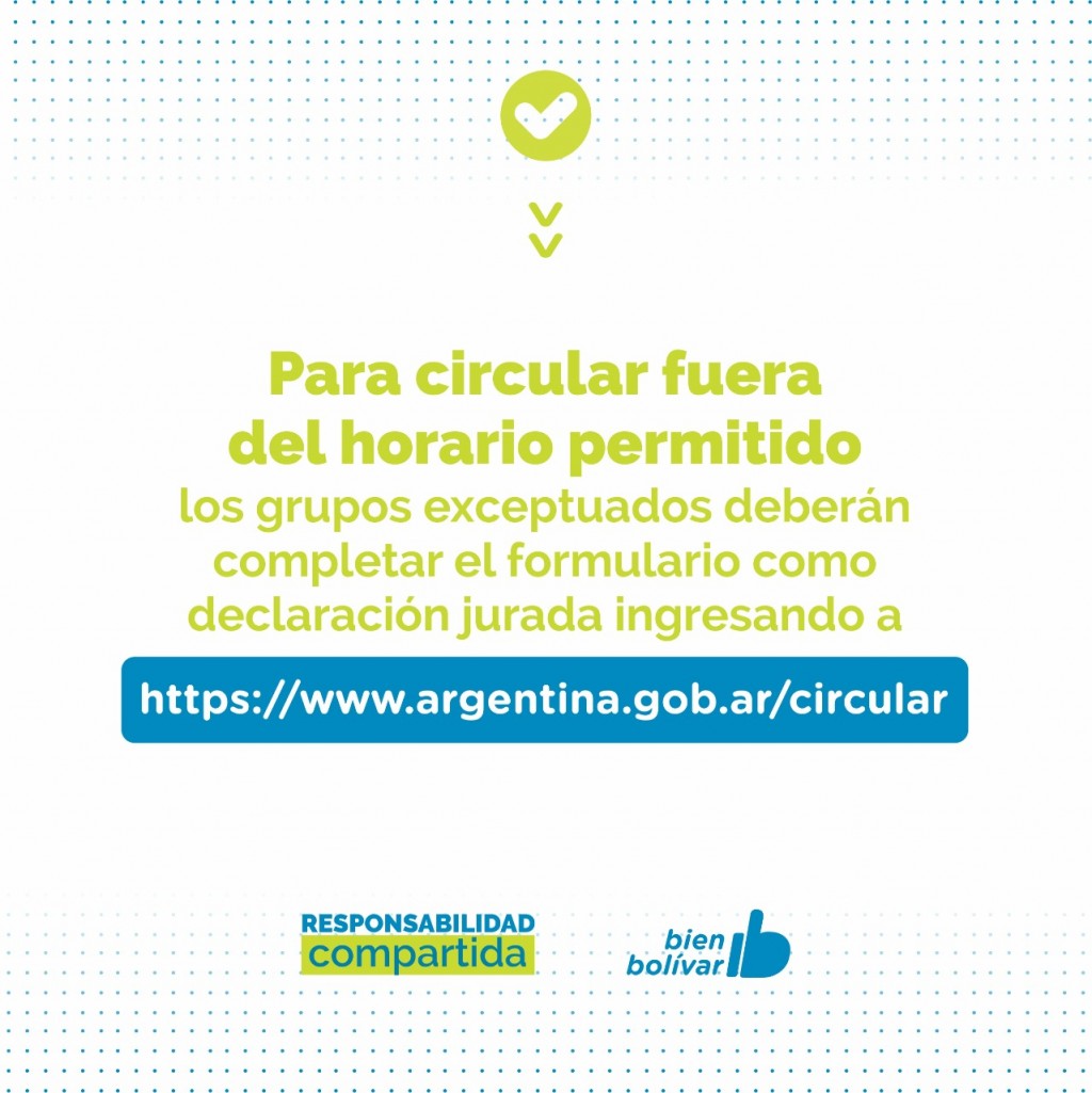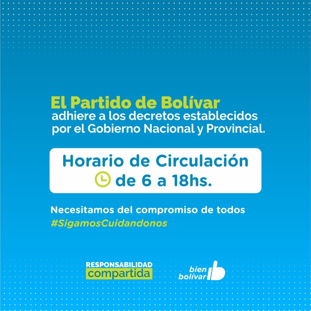 EMERGENCIA SANITARIA   EL PARTIDO DE BOLÍVAR ADHIERE A LAS NUEVAS MEDIDAS RESTRICTIVAS ESTABLECIDAS POR EL GOBIERNO NACIONAL Y PROVINCIAL   Ante el alto riesgo epidemiológico del Partido de Bolívar, por el incremento desmedido de casos de Covid-19 en los último días y la crítica situación hospitalaría, el Gobierno Municipal adhiere a las nuevas restricciones establecidas en el DNU N° 334/2021. Las  disposiciones regirán a partir del miércoles 26 de mayo, teniendo en cuenta los feriados establecidos por el Gobierno Nacional para este 24 y 25 de Mayo.    El horario de circulación permitido será de 6 a 18hs; y estarán habilitadas con apertura al público dentro de este horario las siguientes actividades: rubro alimenticio, farmacias, atención en consultorios médicos, ópticas, expendio de combustibles, gomerías y talleres mecánicos (auxilios y emergencias).    Por su parte, las ferreterías, veterinarias, los comercios de venta de artículos de limpieza y las forrajerias, deberán funcionar con atención al cliente y entrega de mercadería en la vereda, es decir, al aire libre fuera del local.   Los locales gastronómicos estarán habilitados para trabajar con retiro en el lugar de 6 a 18hs y bajo modalidad delivery hasta las 23hs. En tanto, los locales comerciales de actividades no esenciales podrán trabajar solo con delivery en el horario de circulación.   Continúa suspendida la actividad en el Palacio Municipal y las Delegaciones Municipales de las localidades, a excepción de la Oficina de Guías de la Municipalidad continuará abierta de 8 a 12hs; y continuarán cerrados el Parque Las Acollaradas y el Cementerio, Cine Avenida, bares, centros comerciales, y galerías. En cuanto a las casas velatorias y funerarias deberán funcionar con permanencia de hasta 2 personas.    Queda permitida la realización de actividades deportivas tales como las caminatas individuales al aire libre, de 6 a 18hs y dentro del radio del domicilio. Se suspenden las actividades deportiva grupales tanto en espacios cerrados como al aire libre, la actividad en los clubes, natatorios, gimnasios, fútbol 5, establecimientos destinados a las prácticas y entrenamientos deportivas y las competencias deportivas.    Seguirán suspendidas las reuniones sociales y/o familiares en domicilios particulares y en espacios públicos y privados. Además, permanecerán cerrados los salones de eventos y juegos infantiles, quedan suspendidas las actividades y los eventos religiosos y la permanencia en espacios públicos.    Mediante forma remota o teletrabajo podrán funcionar los profesionales liberales, corredores y martilleros públicos, actividad inmobiliaria y aseguradoras, actividad administrativa en sindicatos, entidades gremiales, cajas y colegios profesionales, entidades civiles y deportivas, obras sociales y universidades, actividad administrativa en empresas industriales, de construcción, comerciales y/o servicios.    En el marco de las medidas de prevención se podrá circular solo si perteneces a alguno de los grupos exceptuados y se deberá completar el formulario como declaración jurada que se encuentra en la página https://www.argentina.gob.ar/circular   En medio de la segunda ola de casos que atraviesa el Partido, y con el objetivo de frenar la curva de contagios, la gestión municipal solicita el acompañamiento de la comunidad para cumplir con las medidas establecidas hasta el 30 de mayo inclusive.   Prensa Municipal