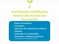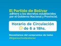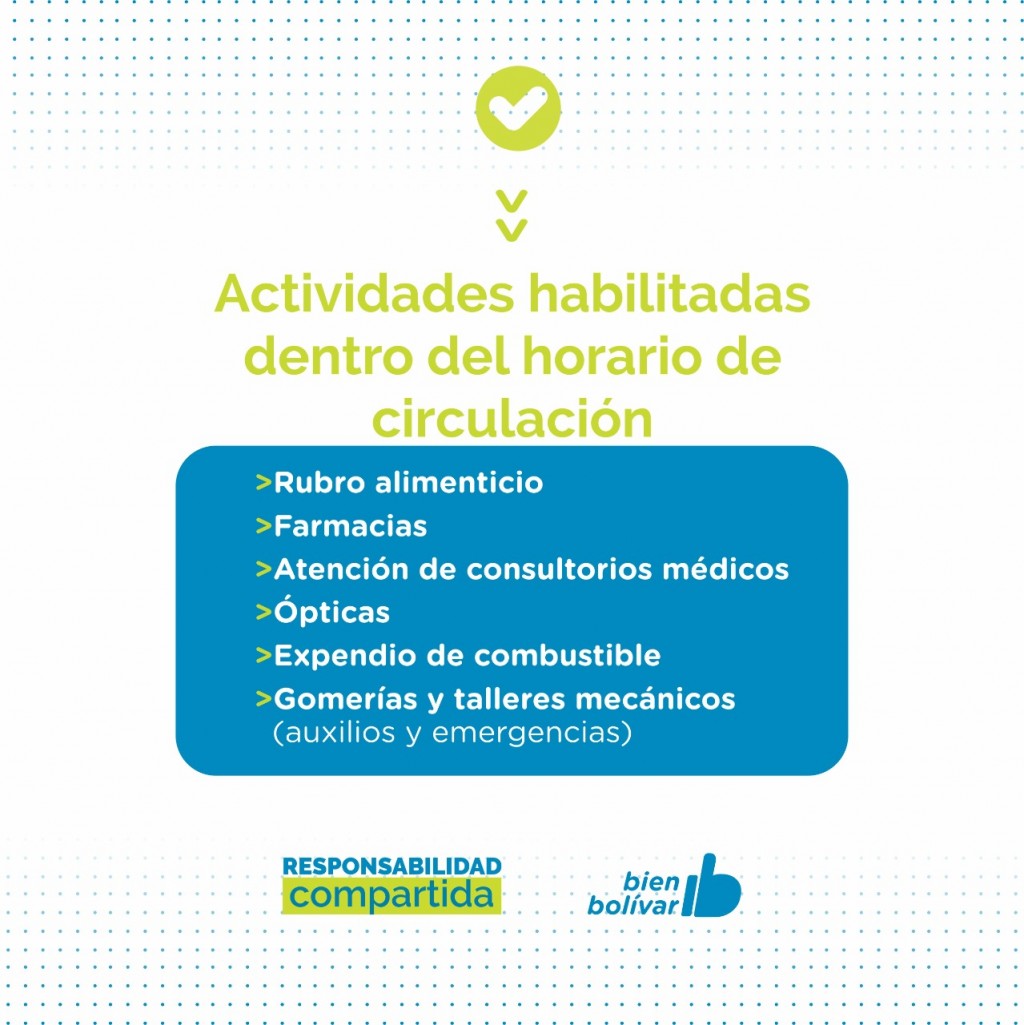 El horario de circulación permitido será de 6 a 18hs; y estarán habilitadas con apertura al público dentro de este horario las siguientes actividades: rubro alimenticio, farmacias, atención en consultorios médicos, ópticas, expendio de combustibles, gomerías y talleres mecánicos (auxilios y emergencias). -