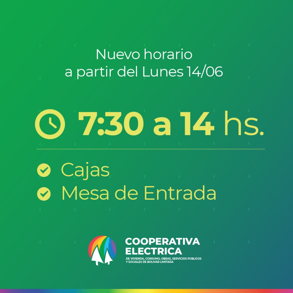 La Cooperativa Eléctrica de Bolívar informa que a partir del próximo Lunes 14 de Junio vuelve a su horario de atención habitual de 7:30 a 14:00 hs. de Lunes a Viernes.