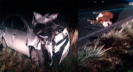 Un conductor mayor de edad que circulaba a unos 10 kilómetros de Bolívar (sentido a 9 de Julio9 por ruta provincial 65, no pudo evitar el fuerte golpe ante un vacuno sobre la cinta asfáltica.-