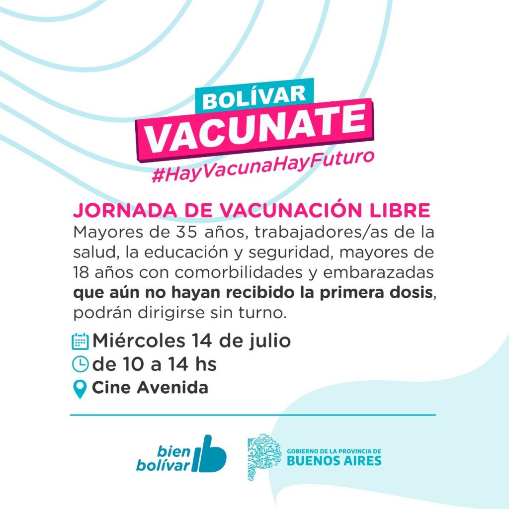 celaLa posta de vacunación libre en Bolívar se instalará este miércoles 14, de 10 a 14hs, en el Cine Avenida. Aquellas personas mayores de 35 años que quieran vacunarse podrán hacerlo presentando el DNI que acredite que residen en el distrito.