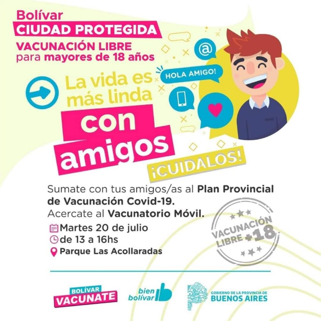 VACUNACIÓN LIBRE PARA MAYORES DE 18 AÑOS   BOLÍVAR DECLARADA CIUDAD PROTEGIDA CONTRA EL CORONAVIRUS   El Partido de Bolívar fue declarado como Ciudad Protegida contra el Coronavirus por el Gobierno Provincial, tras haber inmunizado a más del 95% de la población con al menos la primera dosis de las vacunas contra el Covid-19.   Esta tarde, en conferencia de prensa el gobernador de la provincia de Buenos Aires, Axel Kicillof, actualizó el sistema de fases y si bien Bolívar continuará en la fase 2 de la cuarentena administrada, por el avance de la campaña de vacunación fue declarada Ciudad Protegida junto a otros 78 municipios.    De esta forma, anunció que todos los mayores de 18 años que aún no hayan sido inoculados podrán recibir la primera dosis del esquema vacunatorio bajo la modalidad de vacunación libre, solo con presentar en la posta de vacunación el DNI que acredite domicilio en el distrito.    En línea con los nuevos anuncios, la Gestión Municipal iniciará las jornadas de vacunación libre para mayores de 18 años en la localidad de Hale, donde el Vacunatorio Móvil se instalará en la Delegación Municipal este martes 20, de 9 a 12hs. Mientras que, se dispondrá en Bolívar una nueva posta de vacunación, que será ubicada en el Parque Las Acollaradas, de 13 a 16hs, donde todas aquellas personas que quieran vacunarse podrán hacerlo sin turno previo.