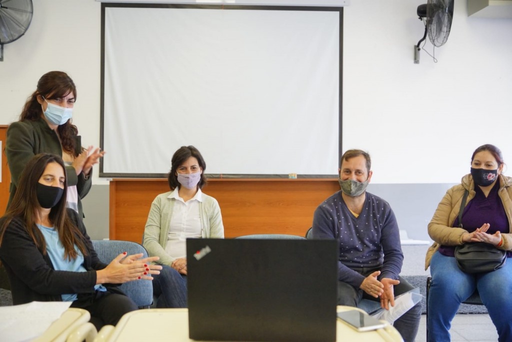 La secretaria de Gobierno, Fernanda Colombo y la directora de Vivienda, Hábitat y Desarrollo Urbano, Érica Moriones, acompañaron a dos familias beneficiarias de créditos PROCREAR línea construcción en el acto de firma con el Banco Hipotecario, que se realizó mediante videoconferencia.