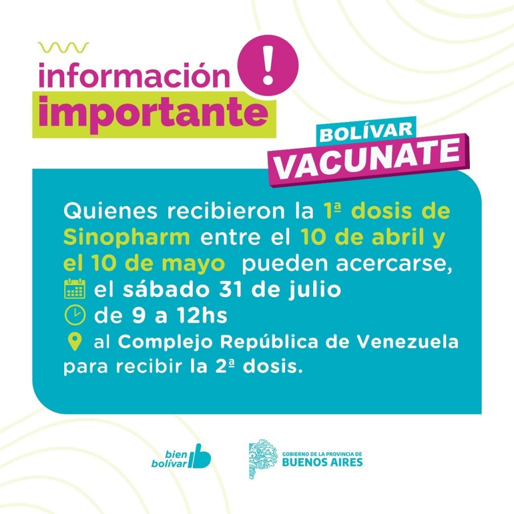 El equipo de Salud informa a la comunidad que quienes hayan recibido la primera dosis de Sinopharm entre el 10 de abril y el 10 de mayo, podrán dirigirse este sábado 31 de julio, de 9 a 12hs, al vacunatorio ubicado en el Complejo República de Venezuela para recibir la segunda dosis de la vacuna. -