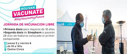 CAMPAÑA DE VACUNACIÓN    UNA NUEVA JORNADA DE VACUNACIÓN CONTRA EL COVID-19   Este lunes, el intendente municipal comenzó su agenda semanal en el vacunatorio, ubicado en el Complejo República de Venezuela, y junto al diputado Eduardo "Bali" Bucca y el candidato a concejal por el Frente de Todos, Pablo Soria, acompañaron al equipo de Salud y a la comunidad en una nueva jornada de vacunación contra el Covid-19.    Con la llegada de 3300 nuevas dosis de AstraZeneca continúa agilizadamente la Campaña de Vacunación en el distrito. El equipo de Salud estará vacunando de manera libre con primeras dosis a mayores de 18 años y segundas dosis de Sinopharm- pasados los 28 días de la primer inoculación - en el Vacunatorio Móvil que se ubicará este jueves 5 y viernes 6, de 10 a 14hs, en el Centro Cívico.    A su vez, la turnera del Ministerio envió turnos para aplicar primeros componentes en menores de 18 años a partir del próximo lunes 9 de agosto, lo que significa un importante avance en el Plan Provincial de Vacunación, que permitirá lograr que la mayor cantidad de habitantes del Partido de Bolívar cuenten con al menos la primera dosis de las vacunas contra el coronavirus.    Esta nueva etapa del plan de vacunación se puso en marcha luego de que la Provincia recibiera esta semana más de 300 mil dosis de la vacuna de Moderna, aprobada para uso pediátrico.   Los y las adolescentes pueden registrarse al Plan Provincial de Vacunación a través de la página web https://vacunatepba.gba.gob.ar/ o de la aplicación VacunatePBA; acercándose al Centro Vacunatorio; o llamando al teléfono 15-48-0073.