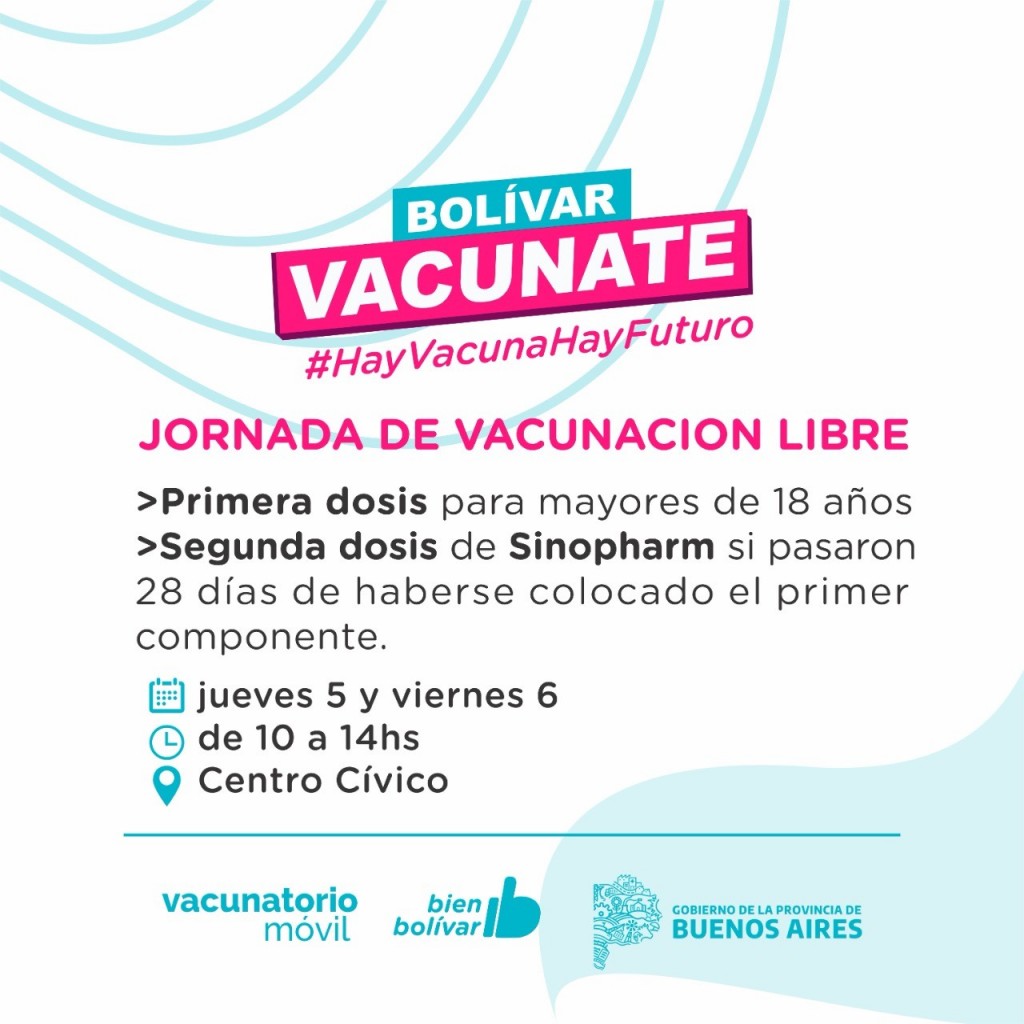BOLÍVAR VACUNATE    JUEVES 5 Y VIERNES 6 EL VACUNACTORIO MÓVIL SE INSTALARÁ EN EL CENTRO CÍVICO PARA AVANZAR CON LA CAMPAÑA DE VACUNACIÓN    El Plan Provincial de Vacunación avanza sin interrupciones en el Partido de Bolívar y debido a la disponibilidad de vacunas, se desarrollarán dos nuevas jornadas de inoculación en el Centro Cívico.    Este jueves 5 y viernes 6, de 10 a 14hs, el equipo de Salud estará vacunando con primeras dosis de manera libre a mayores de 18 años; y con segundas dosis de Sinopharm, si pasaron 28 días de haberse colocado el primer componente.    Son hasta el momento 25.234 los y las vecinos/as del Partido que se vacunaron desde el comienzo de la campaña en las diferentes postas de vacunación instaladas por la Gestión Municipal en Bolívar y las localidades.     Cabe recordar que los y las jóvenes menores de 18 años pueden registrarse al Plan Provincial de Vacunación a través de la página web https://vacunatepba.gba.gob.ar/ o de la aplicación VacunatePBA; acercándose al Centro Vacunatorio; o llamando al teléfono 15-48-0073.    En el marco de la Emergencia Sanitaria y con la finalidad de seguir manteniendo las medidas preventivas, es importante tener en cuenta que ante la presencia de síntomas se encuentra dispuesto, en el ingreso al Hospital M. Capredoni, el Centro de Testeo Rápido que funciona los días lunes, miércoles, viernes y sábado de 8 a 12hs; y los martes y jueves de 12 a 16hs.