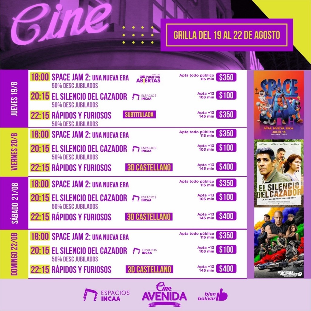 El Avenida renueva la cartelera para este fin de semana con la superproducción para toda la familia “Space Jam 2: Una nueva era” y el Thriller protagonizado por Pablo Echarri “El silencio del cazador”, en el marco de Espacio INCAA. Además, se mantiene en la programación la novena entrega de la saga de acción y autos que rompió el récord de recaudación en tiempos de pandemia: “Rápidos y Furiosos 9”.