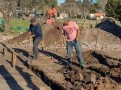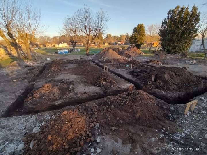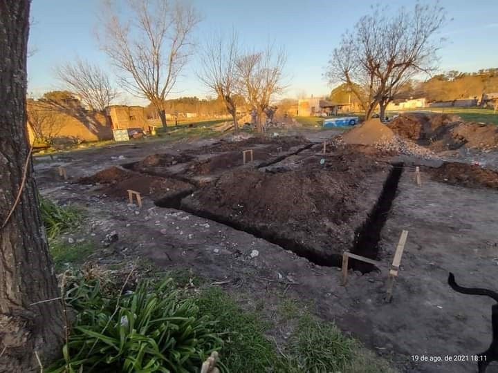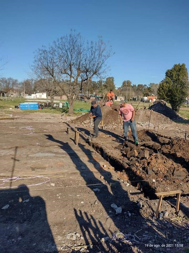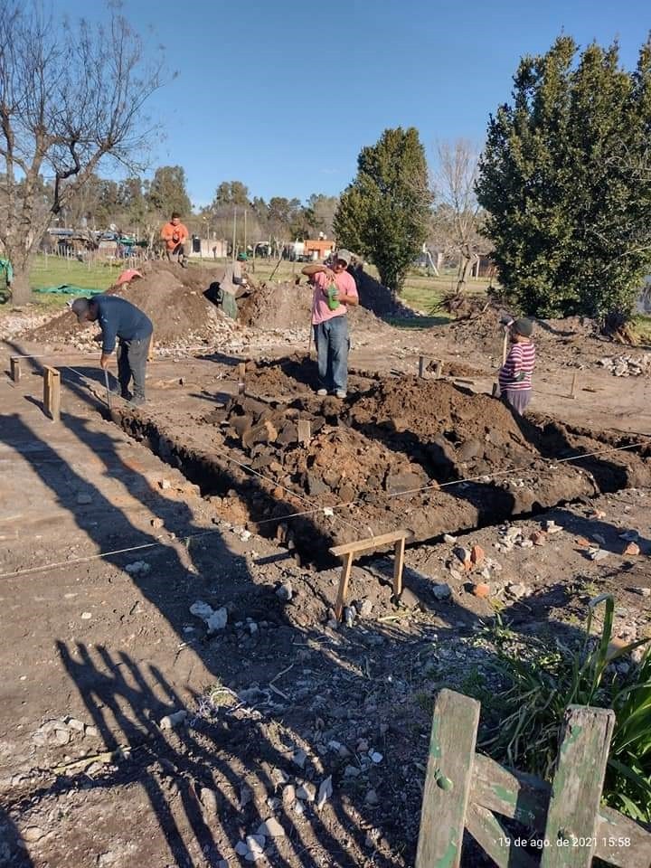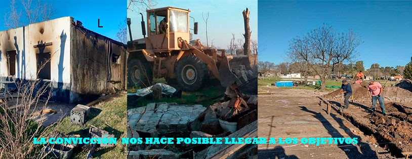 Amigos albañiles de Agustín ya comenzaron con el marcado de cavado de los cimientos. Una vez que finalizó la tarea de demolición con la máquina municipal, dejando en claro que no se pudieron reciclar chapas, tirantes ni ladrillos. Debido al daño generalizado de las llamas que partieron hasta el contrapiso de la vivienda.