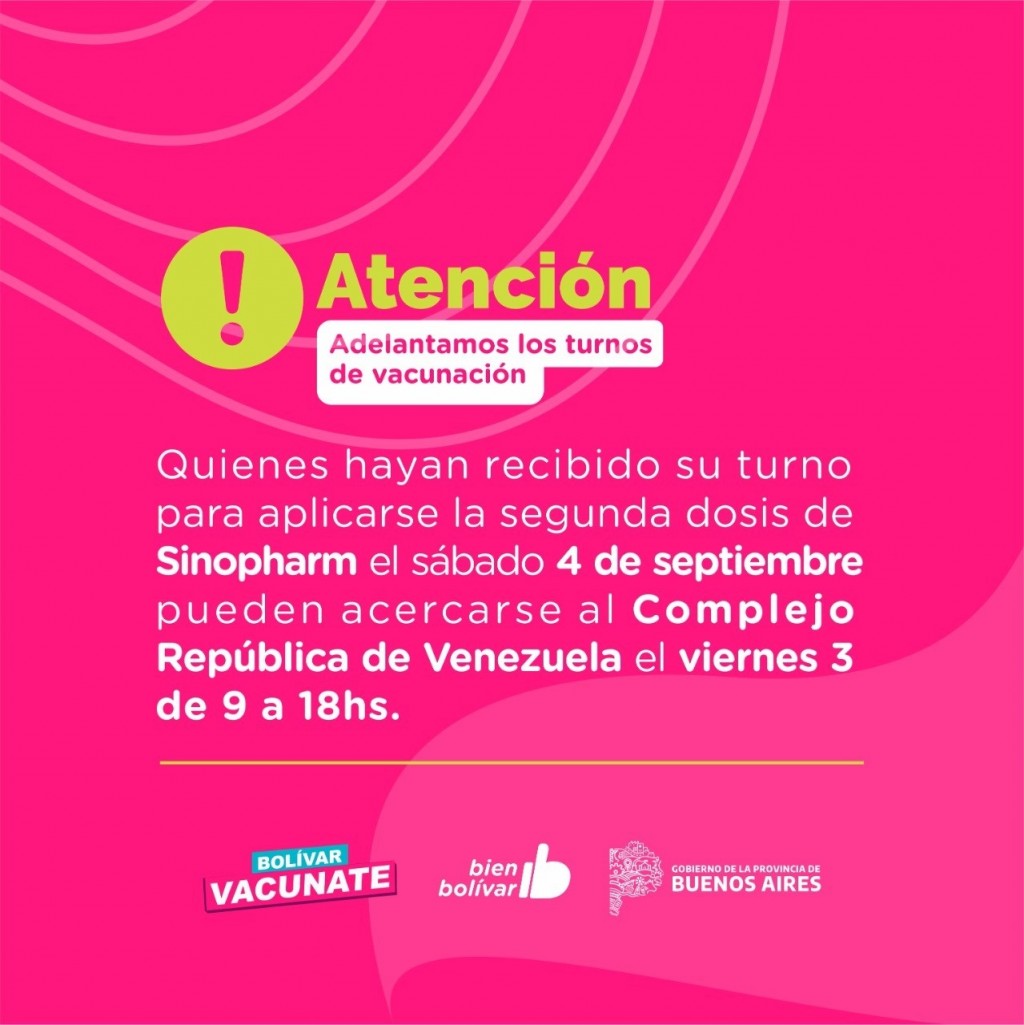 Las personas con turno asignado podrán asistir al Complejo República de Venezuela este viernes 3, de 9 a 18hs, para recibir su segunda dosis. Por esto se solicita a la comunidad revisar los canales de comunicación declarados al momento de la inscripción para no perder el turno.-