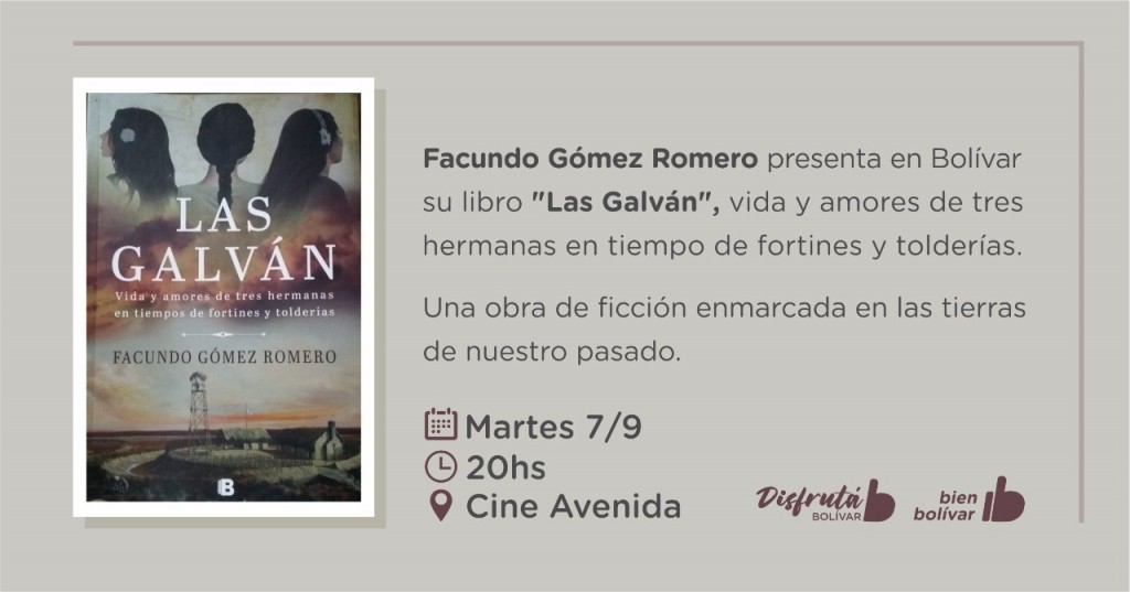 El martes 7 de septiembre a las 20hs, en el Cine Avenida el autor Facundo Gómez Romero presenta en Bolívar su libro "Las Galván", una obra de ficción que trata la vida y amores de tres hermanas en tiempo de fortines y tolderías, enmarcada en las tierras de nuestro pasado.