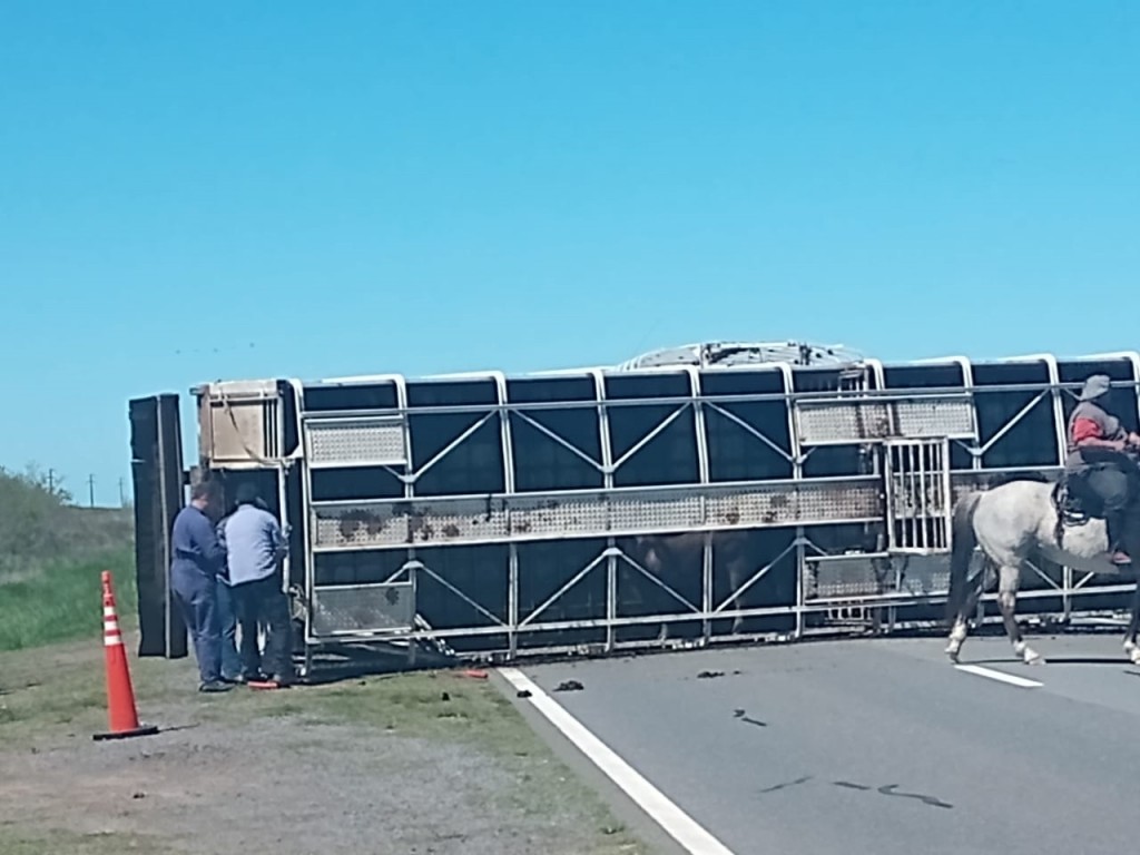Por causas que se desconocen, al menos al momento de publicar esta información, un camión Scania p310, con dominio colocado MRA-163, que remolcaba un acoplado  NDO-192, aplicado al transporte de hacienda, y perteneciente a una firma de Tres arroyos, sufrió un vuelco.