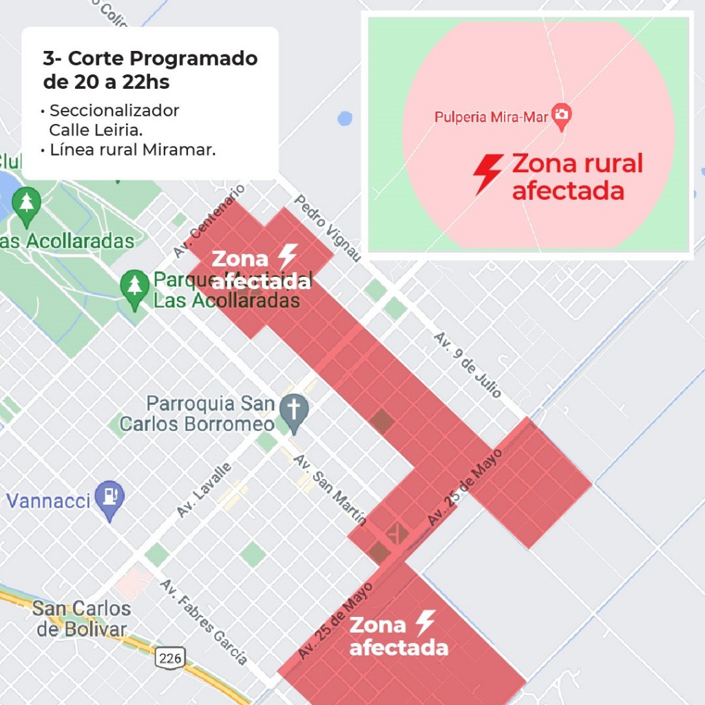 En función del cronograma elaborado por EDEN, está previsto que tengamos en Bolívar este Domingo 3 de Octubre, una restricción de 1,8MW entre las 12 y las 14hs y una restricción de 2MW entre las 18 y las 22hs. A tal efecto, nos vemos obligados a cumplir con lo requerido por EDEN y es por ello que planificamos realizar las siguientes restricciones de carga: 1- Corte programado de 12 a 14hs 1. Seccionador Bajo Carga Avenida Pedro Vignau. 2. Reconectador línea Rural Paula-Vallimanca.