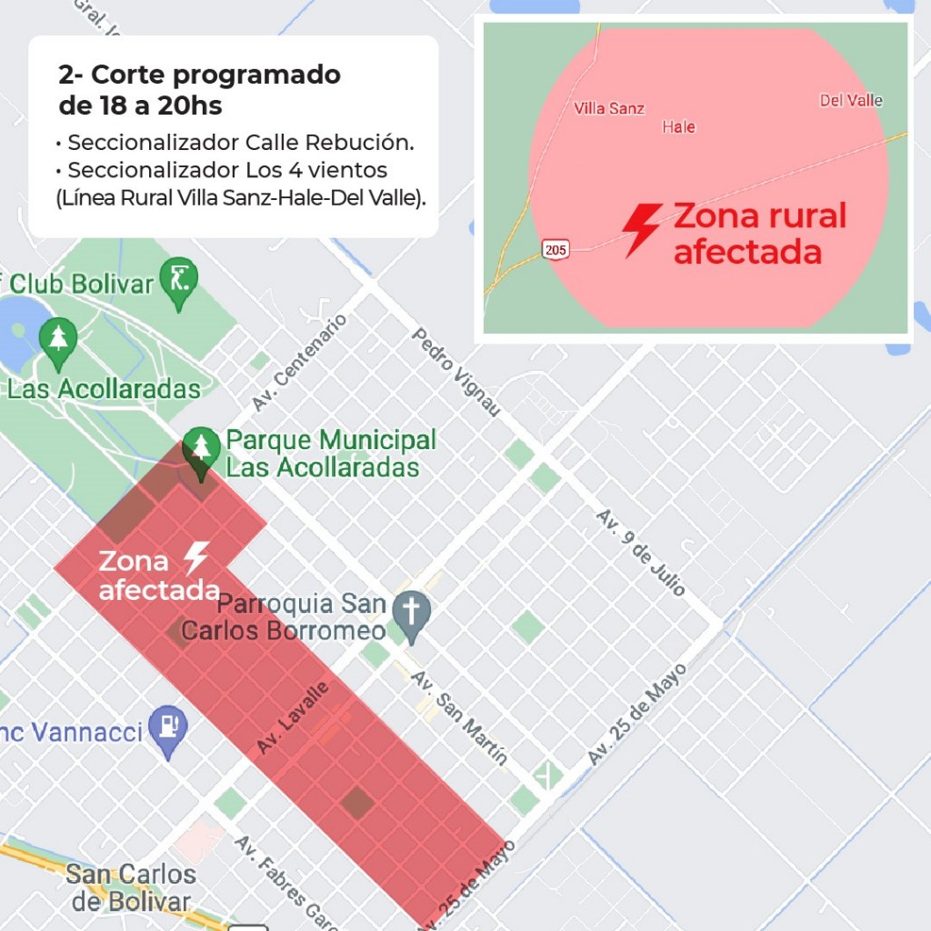 Para poder trabajar sobre los transformadores, es necesario sacarlos de servicio y es por ello que es posible, dependiendo del nivel de carga, que soliciten restricción de carga (Cortes del suministro eléctrico). En función del cronograma elaborado por EDEN, está previsto que tengamos en Bolívar este Domingo 3 de Octubre, una restricción de 1,8MW entre las 12 y las 14hs y una restricción de 2MW entre las 18 y las 22hs. A tal efecto, nos vemos obligados a cumplir con lo requerido por EDEN y es por ello que planificamos realizar las siguientes restricciones de carga: 1- Corte programado de 12 a 14hs 1. Seccionador Bajo Carga Avenida Pedro Vignau. 2. Reconectador línea Rural Paula-Vallimanca. Dichos cortes afectarán las siguientes zonas:
