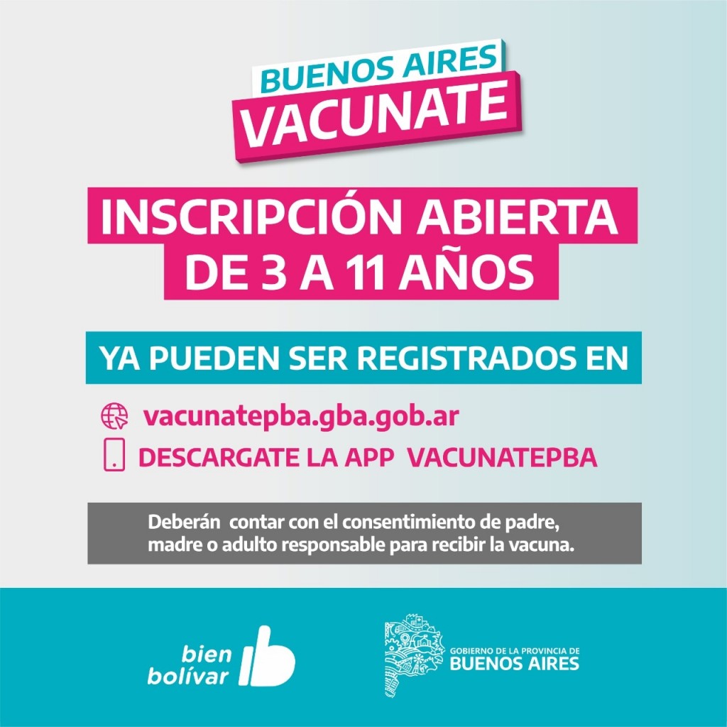 CAMPAÑA DE VACUNACIÓN     SE ENCUENTRA ABIERTA LA INSCRIPCIÓN AL PLAN PROVINCIAL DE VACUNACIÓN PARA NIÑOS/AS DE ENTRE 3 Y 11 AÑOS     Tras el anuncio del Gobierno Nacional, la Secretaría de Salud del Municipio, informa que se encuentra abierta la inscripción para registrar a niñas y niños de 3 a 11 años, en el Plan Provincial de Vacunación Covid-19.    La autorización para la aplicación de vacunas en ese rango etario, fue recibida por la Administración Nacional de Medicamentos, Alimentos y Tecnología Médica (ANMAT) y comunicada a Salud, luego de que la empresa desarrolladora aprobara su uso al evidenciar datos positivos en los ensayos realizados en la población de Emiratos Árabes.   La inscripción debe realizarse con el consentimiento de un adulto responsable, padre/madre o tutor. El registro se puede llevar a cabo a través del sitio web vacunatepba.gba.gob.ar; acercándose al Centro Vacunatorio, de lunes a sábado de 9 a 13hs; o llamando al teléfono 2314-61-4690.   Prensa Municipalidad de Bolívar