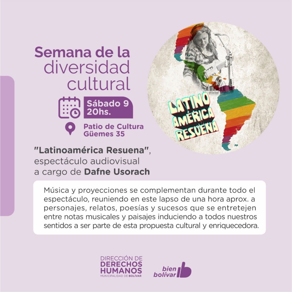 El sábado 9 a las 20hs, en el patio de la Dirección de Cultura, en Güemes 35, tendrá lugar el espectáculo audiovisual "Latinoamérica Resuena", a cargo de Dafne Usorach, con entrada gratuita y sujeto a protocolos sanitarios vigentes.