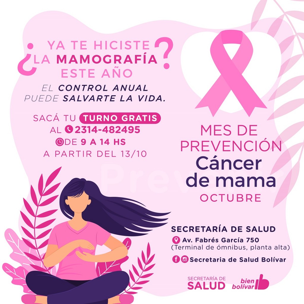 Desde este miércoles y hasta finalizar octubre, las interesadas pueden realizarse la mamografía de manera gratuita, solicitando turno al teléfono 2314 – 482495, de lunes a viernes de 9 a 14hs.
