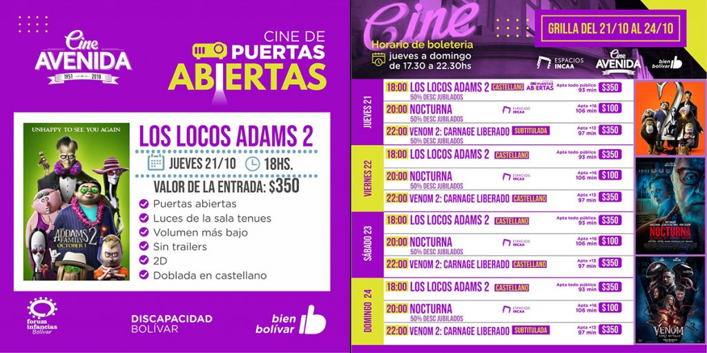 Además, el jueves 21 a las 18hs con “Los Locos Adams 2” se lleva a cabo una nueva función de la iniciativa Cine de Puertas Abiertas, que tiene como principal característica la proyección de la película con el sonido más bajo, las puertas de la sala abiertas y las luces encendidas, con el fin de garantizar el acceso de todas las personas al cine.