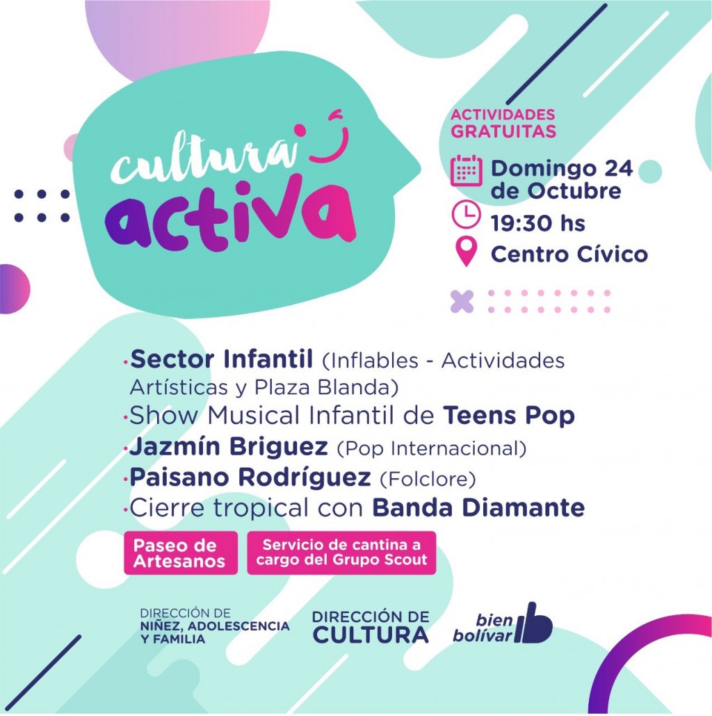 Este domingo, a partir de las 19:30hs, vuelve la propuesta cultural y recreativa “Cultura Activa” al Centro Cívico, organizada por la Dirección de Cultura y la Dirección de Niñez, Adolescencia y Familia de la Municipalidad.