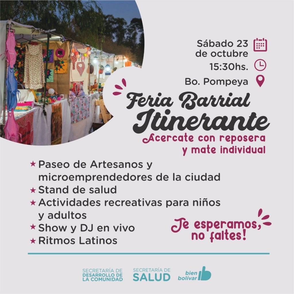 A partir de las 15.30hs, artesanos y micro emprendedores locales ofrecerán sus productos al público, donde también habrá actividades recreativas para niños/as y música, DJ en vivo y clases de ritmos latinos.