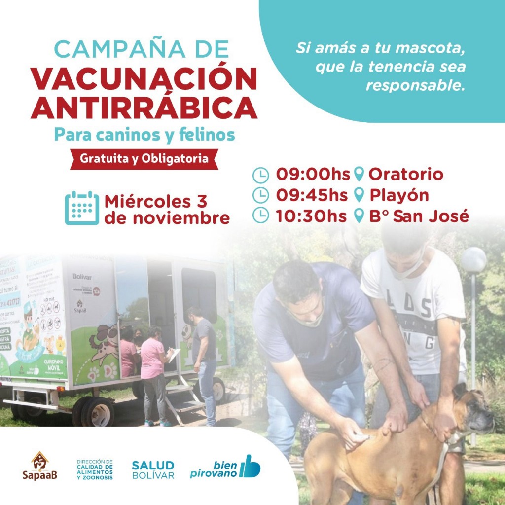 El próximo miércoles 3 de noviembre en Pirovano, la Dirección de Calidad de Alimentos y Zoonosis de la Municipalidad, llevará a cabo una nueva jornada de Vacunación Antirrábica gratuita para perros y gatos.