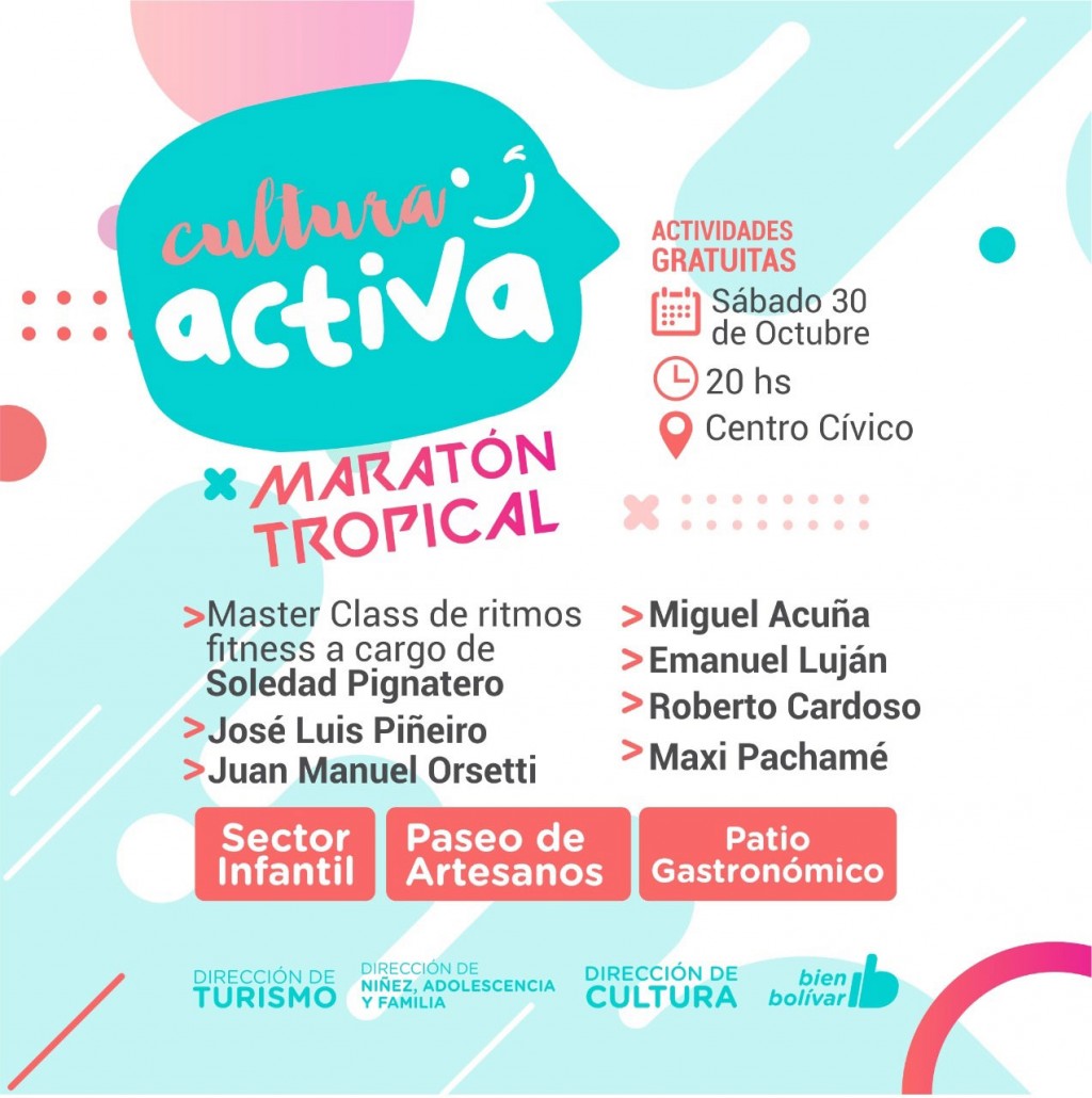 Teniendo en cuenta el pronóstico del Servicio Meteorológico Nacional que anuncia lluvia para el próximo domingo 31, y en el marco de la edición n°22 de la Maratón Internacional Dino Hugo Tinelli, la propuesta municipal “Cultura Activa” tendrá lugar este sábado 30 desde las 20hs, al finalizar el evento deportivo más importante del Partido.