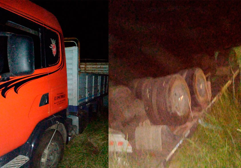 Se trata de un camión Scania, con dominio colocado HNC-428 que remolcaba un acoplado con dominio colocado LHX-871, el cual se encontraba volcado en el préstamo de la ruta.