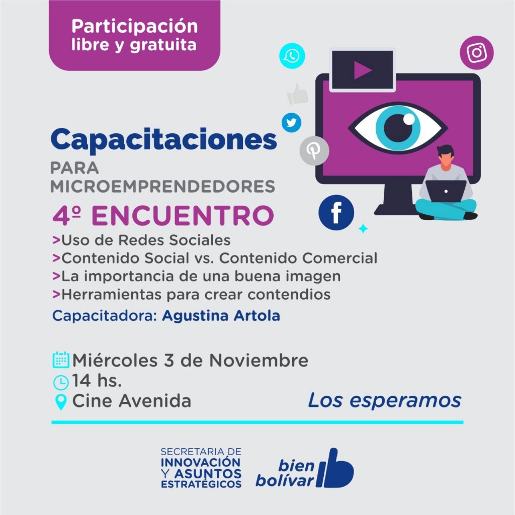 La Municipalidad de Bolívar, a través de la Secretaría de Innovación y Asuntos Estratégicos, a cargo de Francisco de la Serna, llevará a cabo el cuarto encuentro de la capacitación gratuita sobre redes sociales, plataformas de ventas y uso para potenciar productos de emprendedores locales.