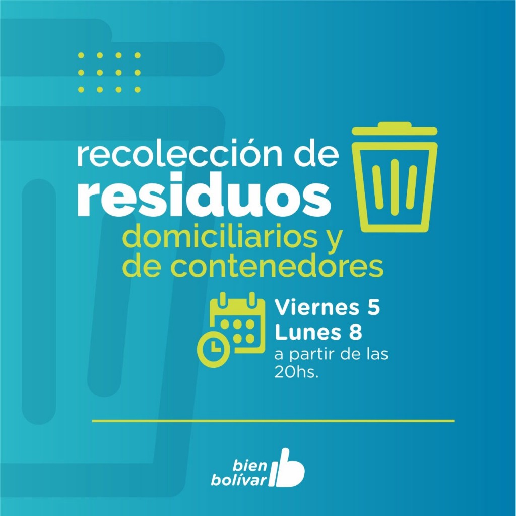 Teniendo en cuenta el feriado administrativo del jueves 4 de noviembre, fecha en la que se conmemora al patrono de nuestra ciudad San Carlos Borromeo, y el feriado administrativo por el Día del Empleado Municipal que se celebra el 8, la recolección de residuos domiciliaria y de contenedores se llevará a cabo los días viernes 5 y lunes 8 a partir de las 20hs.