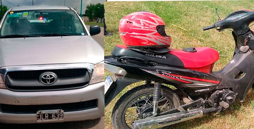 Un conductor a bordo de una Pick Up Toyota Hilux, con dominio colocado JLR-639 y una mujer que se movilizaba en una Gilera Smash 110, colisionaron en avenida Mariano Unzué al 1450.