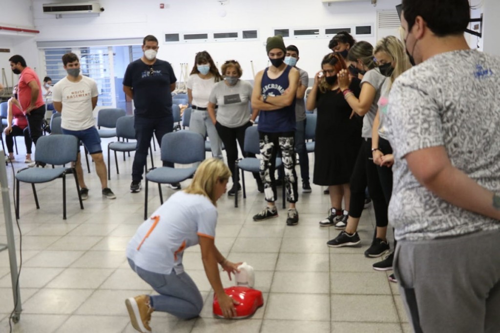 El Dr. Pablo Flores y la enfermera Yanina Carretero estuvieron a cargo de la capacitación en reanimación cardiopulmonar (RCP), en la que se brindó información sobre primeros auxilios, nociones básicas de RCP, maniobras de desobstrucción y se realizó una práctica especial con muñecos donde se resolvieron casos clínicos.